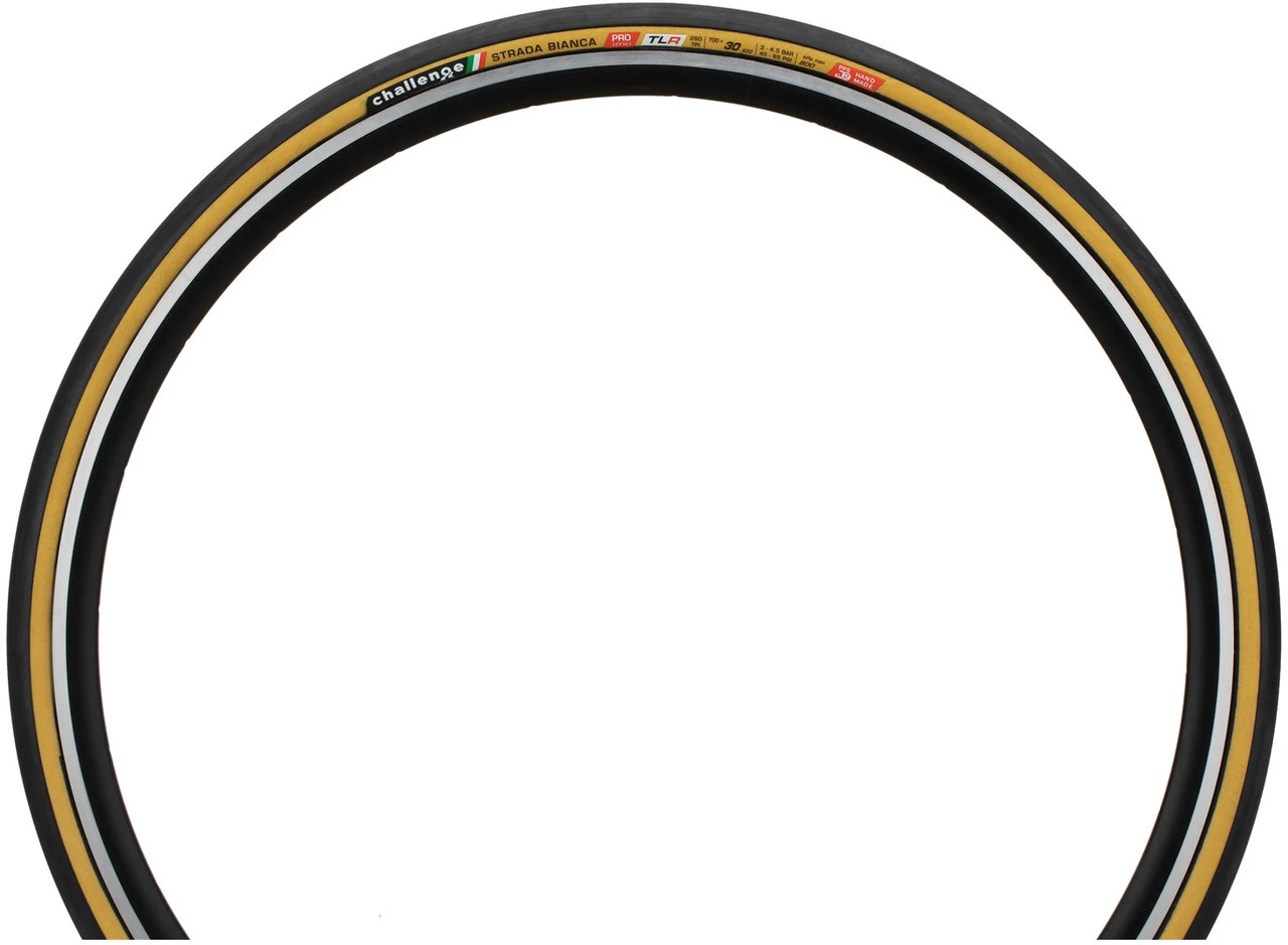 Le Strada Bianca Pro Handmade TLR de Challenge est un pneu souple de 28 pouces fabriqué à la main pour une utilisation sur l’asphalte ou le gravier. Il peut être utilisé sans chambre à air et convainc par son efficacité de roulement, sa contrôlabilité et son grand confort.