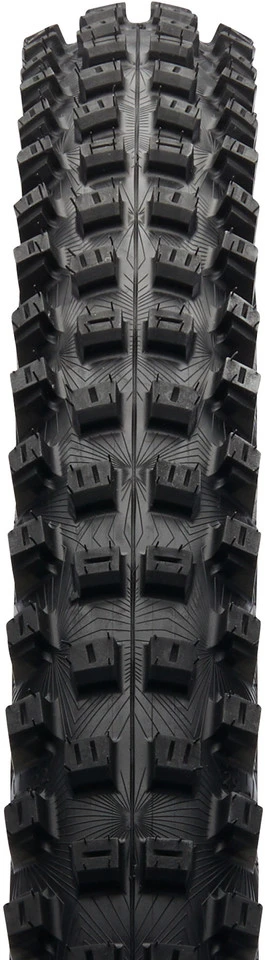 La carcasse Downhill se compose de six couches de matériau de carcasse sous la bande de roulement et de quatre couches sur les côtés, l’insert Apex au-dessus du talon réduit le risque de perforation. Une bande tissée en croix au-dessus du talon du pneu protège en outre le pneu et la zone de la jante.