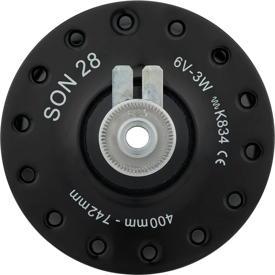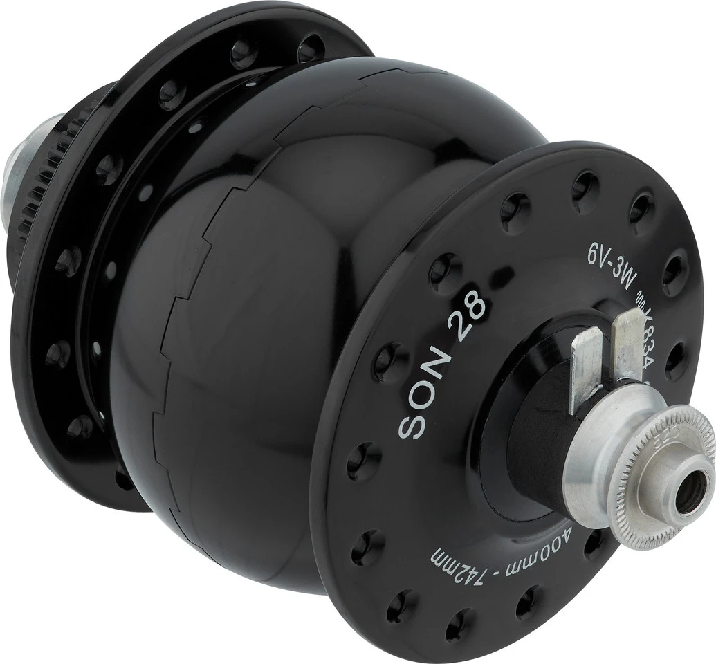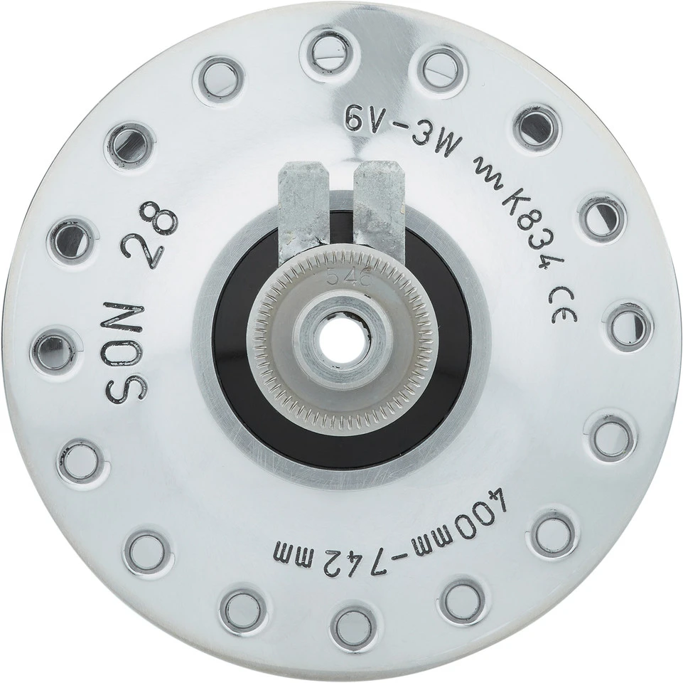 La Son 28 est une dynamo de moyeu universellement approuvée pour toutes les tailles de roues de 16 à 29 pouces. Elle atteint sa puissance nominale dans une roue de 28 pouces à environ 16 km/h. Elle est donc recommandé si un niveau de lumière particulièrement élevé est requis lors d’une conduite lente ou si d’autres appareils doivent être utilisés ou leurs batteries chargées. Par rapport à son prédécesseur Son klassik, les pertes au ralenti ont pu être réduites d’environ 15 % et le poids de 140 g.