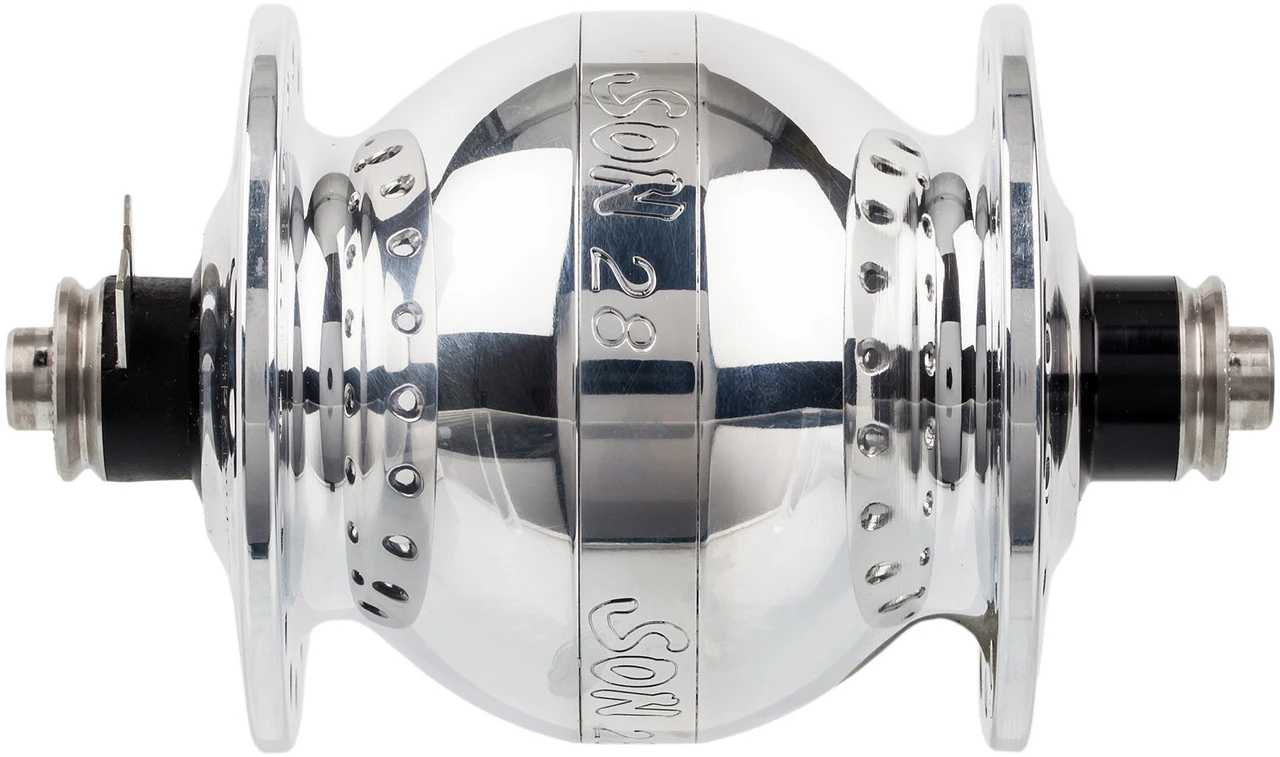La SON 28 est une dynamo de moyeu universellement approuvée pour toutes les tailles de roue de 16″ à 29″ . Elle atteint sa puissance nominale dans une roue de 28 pouces à environ 16 km/h. Elle est donc recommandé si un niveau de lumière particulièrement élevé est requis lors d’une conduite lente ou si d’autres appareils doivent être utilisés ou leurs batteries chargées. Par rapport à son prédécesseur Son klassik, les pertes au ralenti ont pu être réduites d’environ 15 % et le poids de 140 g.