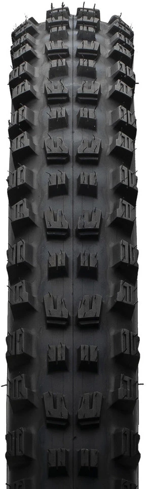 Le profil agressif avec des lamelles profondes et des bords d’attaque étagés sur les crampons centraux, roule bien, garantit une bonne adhérence dans les montées et une bonne stabilité latérale.